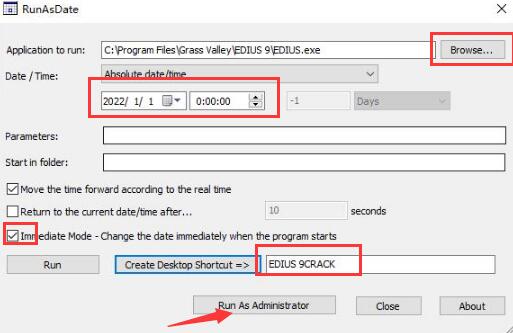 6、在Date/Time栏内设置激活到期时间,自选即可,勾选“”immediate mode -change”,并修改一下快捷方式名称,最后点击Create Desktop Shortcut关闭此界面